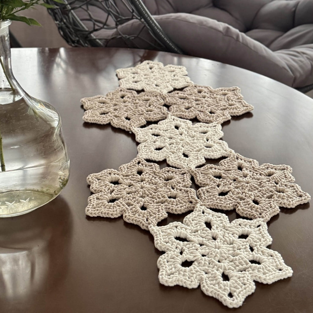 Ранер ручної роботи чудово підкреслить вашу любов до оригінального декору. Стильна річ, яка буде привертати увагу ваших гостей. В даному варіанті ранера входить 7 квіток. Зв'язано із бабовняного шнура. Прати вручну в прохолодній воді. Можна прасувати ( бажано через тоненьку тканину).