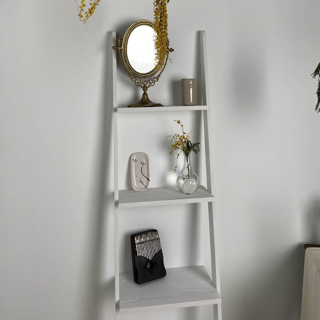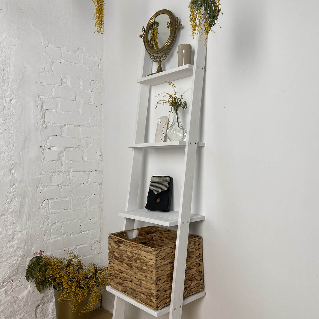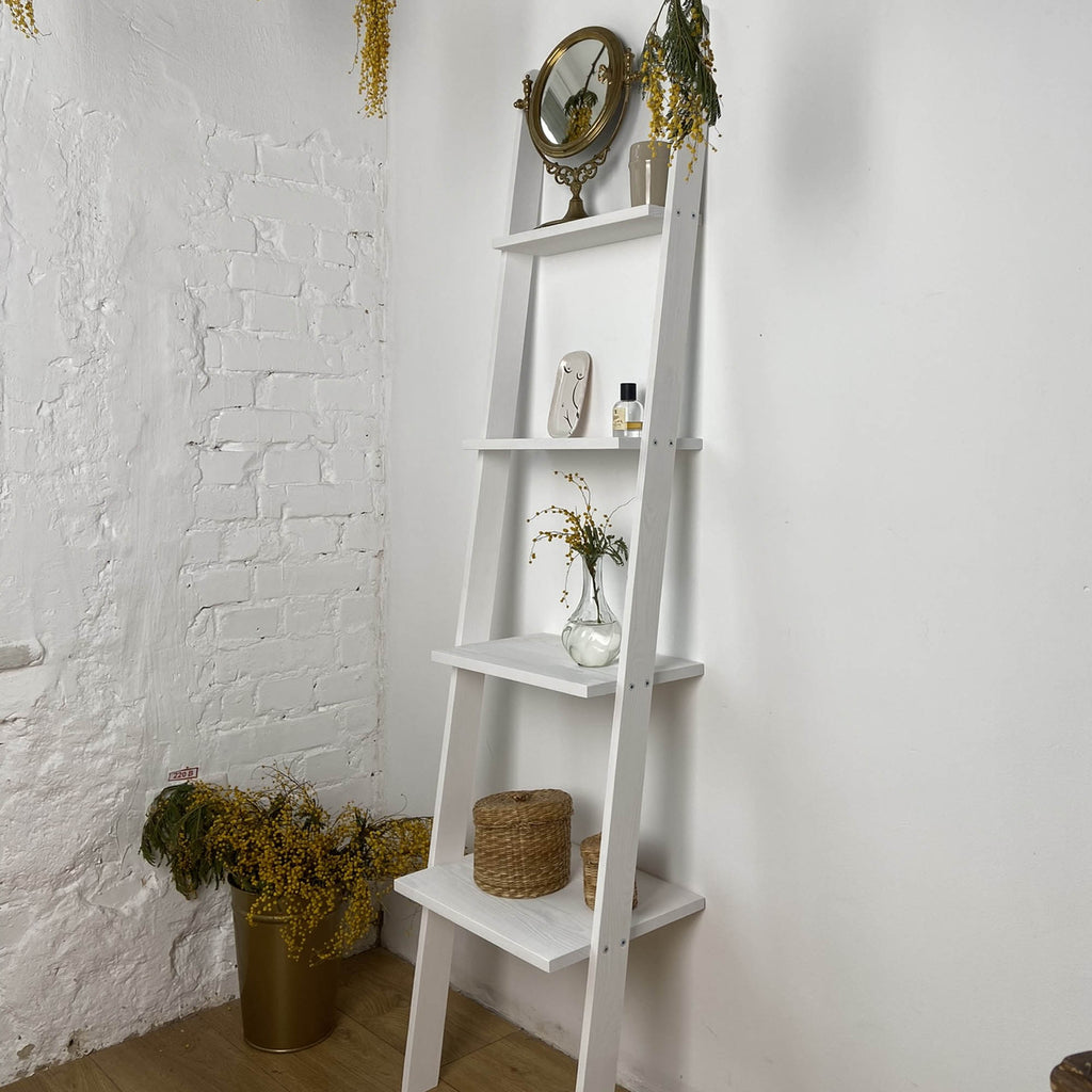 Етажерка-драбинка. Легка, компактна й універсальна. Ця дерев’яна етажерка у формі драбинки — зручне рішення для зберігання у ванній кімнаті, передпокої чи спальні. Лаконічна форма та натуральне покриття додають затишку, а конструкція не потребує кріплень — просто поставте до стіни.