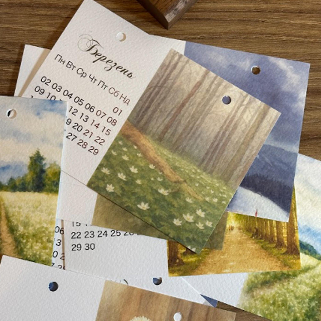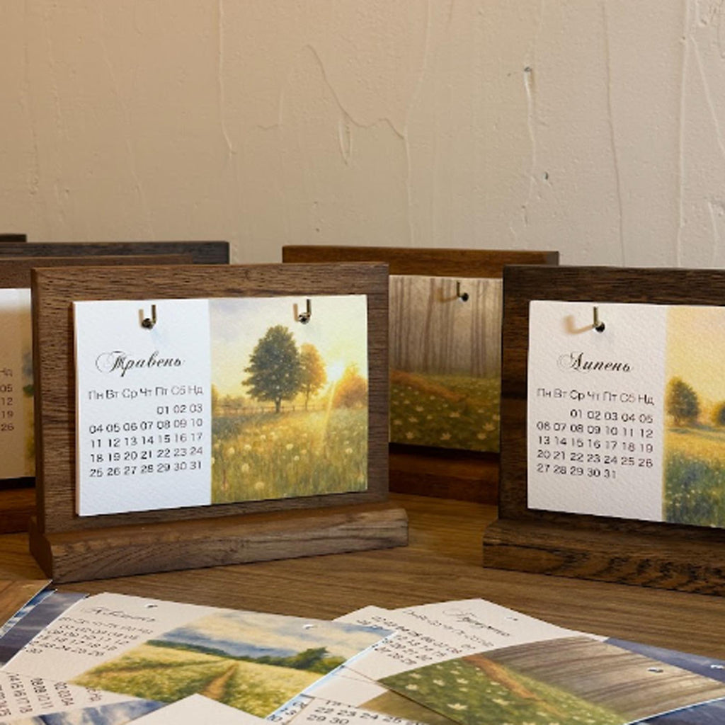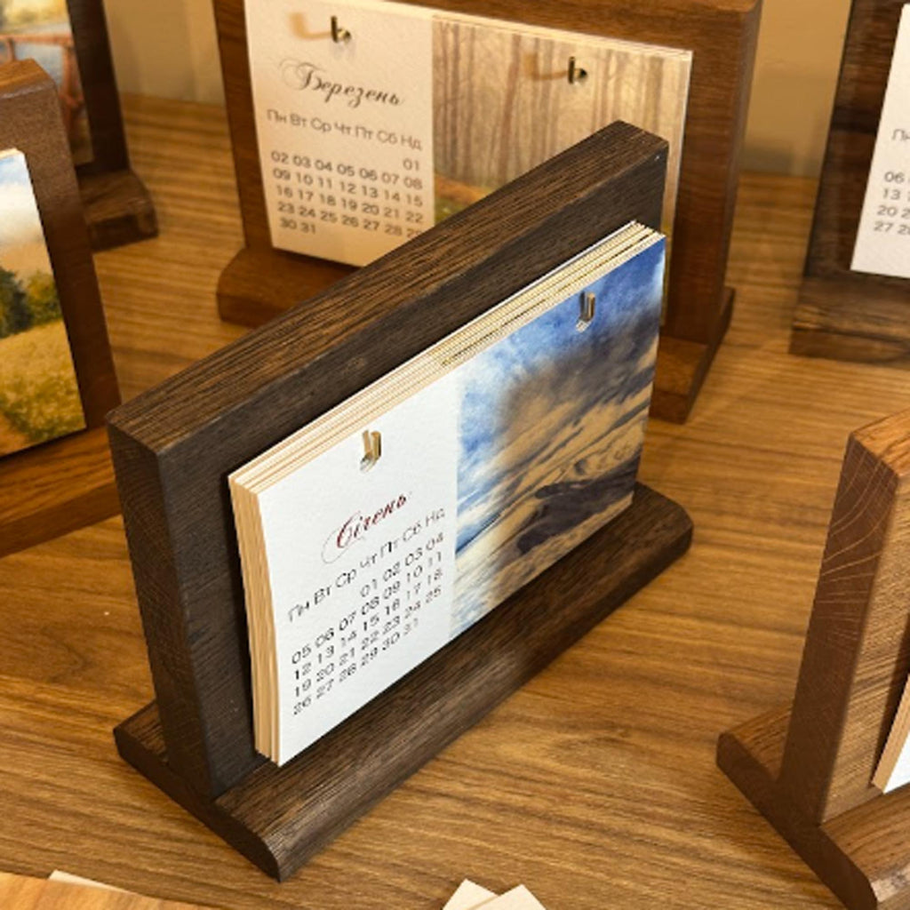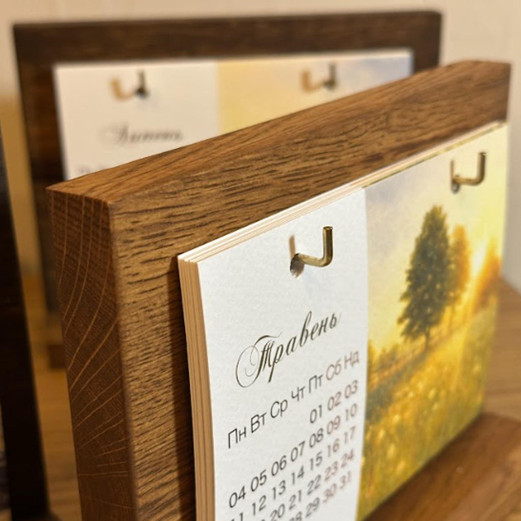 Підставки з натурального дерева ручної роботи вкриті екологічним масло-воском. Авторські акварельні ілюстрації надруковані на щільному текстурованому папері (щільність 300 грам). Колір підставок в двох варіантах: ебенове дерево (темна) та дуб (світліша). Золоті гачки додають краси і завершеності. Підставки можна використовувати для календарів наступних років.