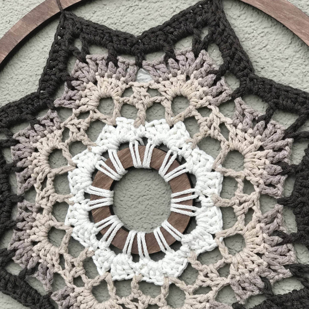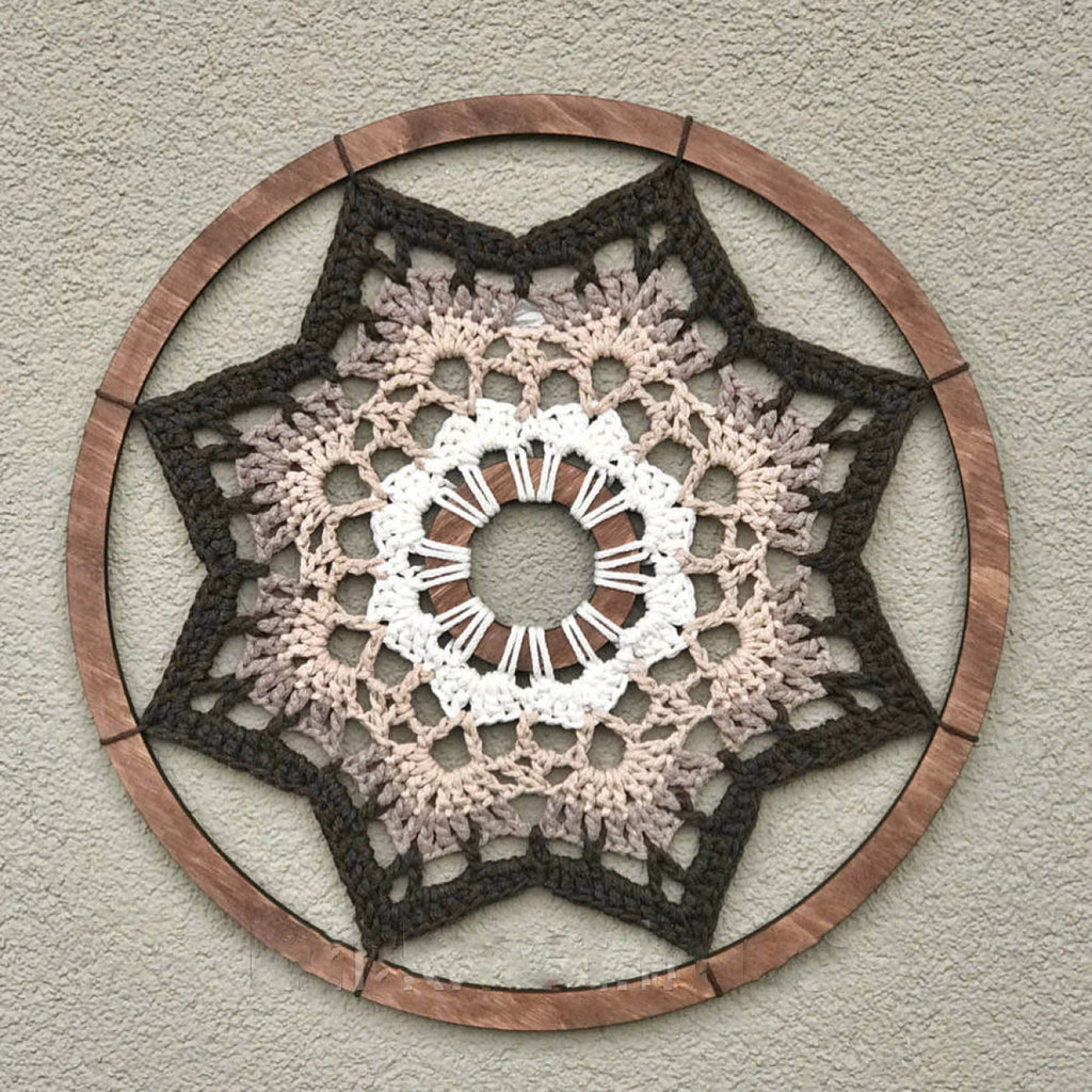 Панно 35 см, декоративне — стильний елемент інтер’єру, який поєднує природні кольори та витончене плетіння. Теплі відтінки коричневого, бежевого й білого створюють атмосферу спокою та гармонії, додаючи затишку будь-якому простору. Виготовлене вручну з бавовняного шнура, панно чудово пасує до інтер’єрів у стилі бохо, еко, скандинавському або мінімалістичному.