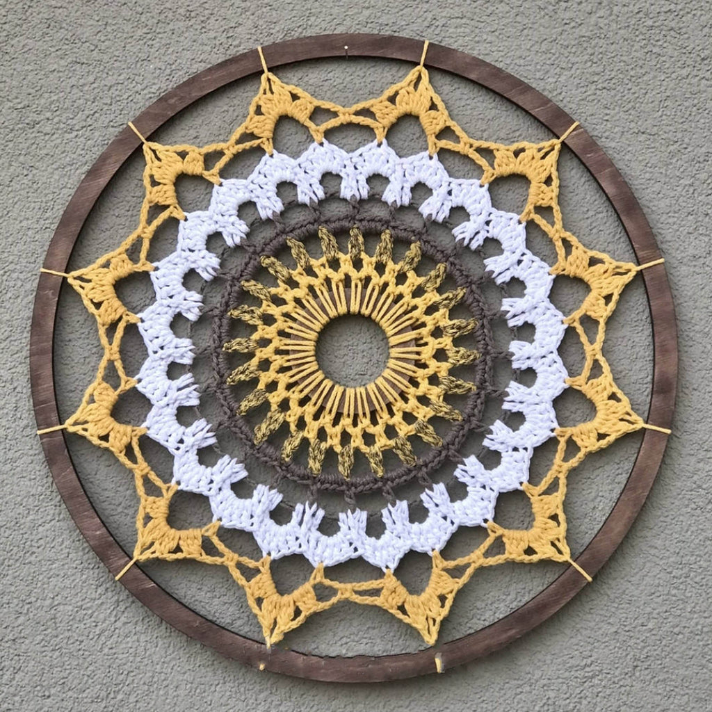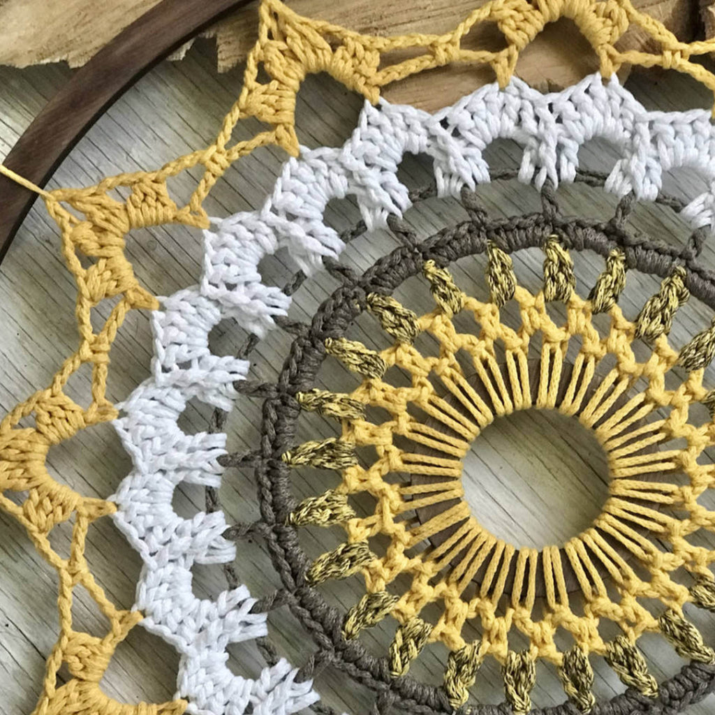 Панно ГАРМОНІЯ — це витончений настінний декор, створений у теплій кольоровій гамі жовтого, білого та какао. Поєднання відтінків і текстури бавовняного шнура надає виробу м’якості та гармонії, а ручне в’язання гачком робить кожне панно унікальним. Такий елемент декору чудово доповнить інтер’єр спальні, вітальні чи дитячої кімнати, додаючи затишку та природної краси.