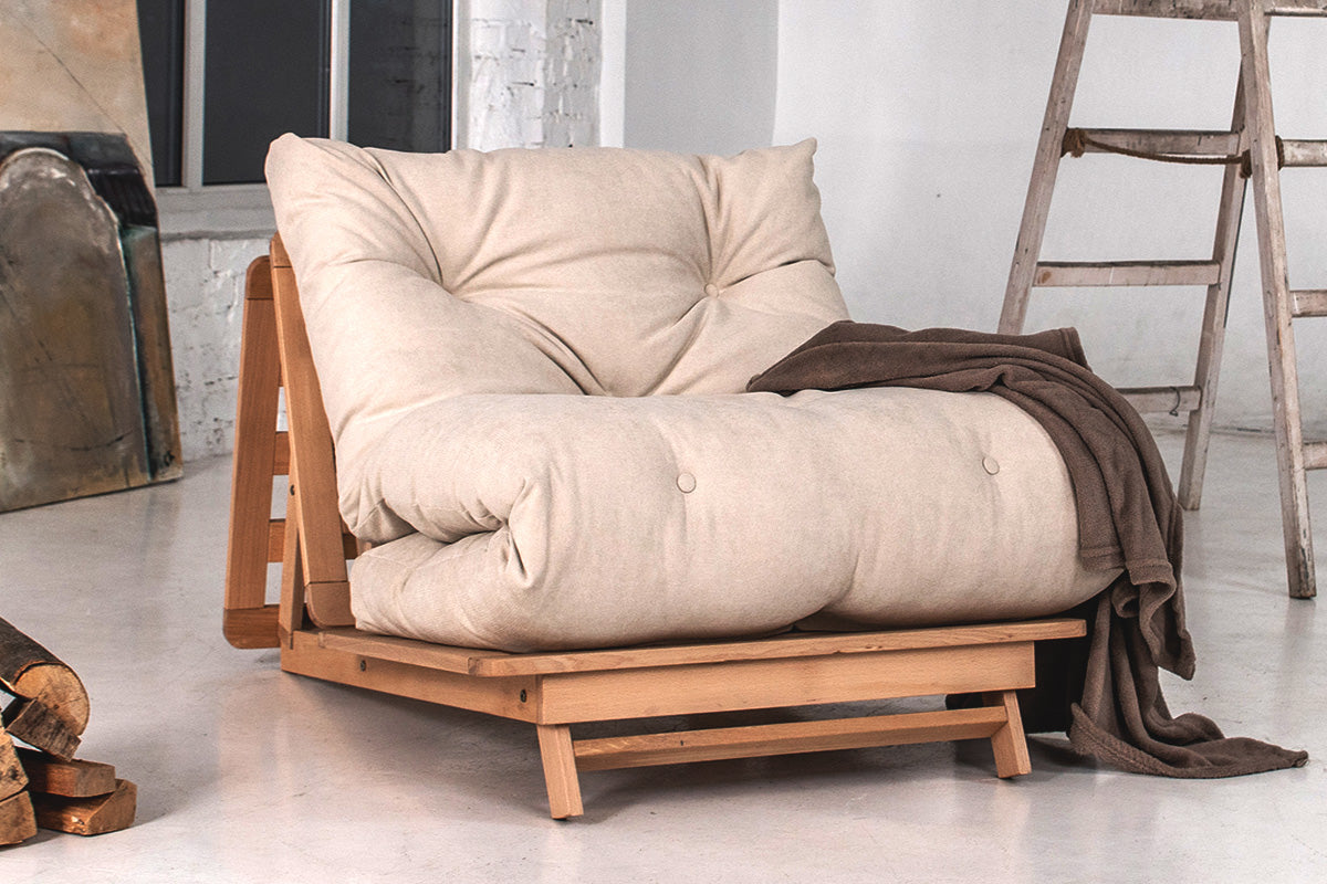 Крісло-футон LAYTI-90 - ідеальне рішення для стильного та комфортного відпочинку. Виготовлене з натурального дерева та м'якої тканини, це крісло легко трансформується у зручний футон. Ідеально підходить для будь-якого інтер'єру, забезпечуючи максимальний комфорт і сучасний вигляд.