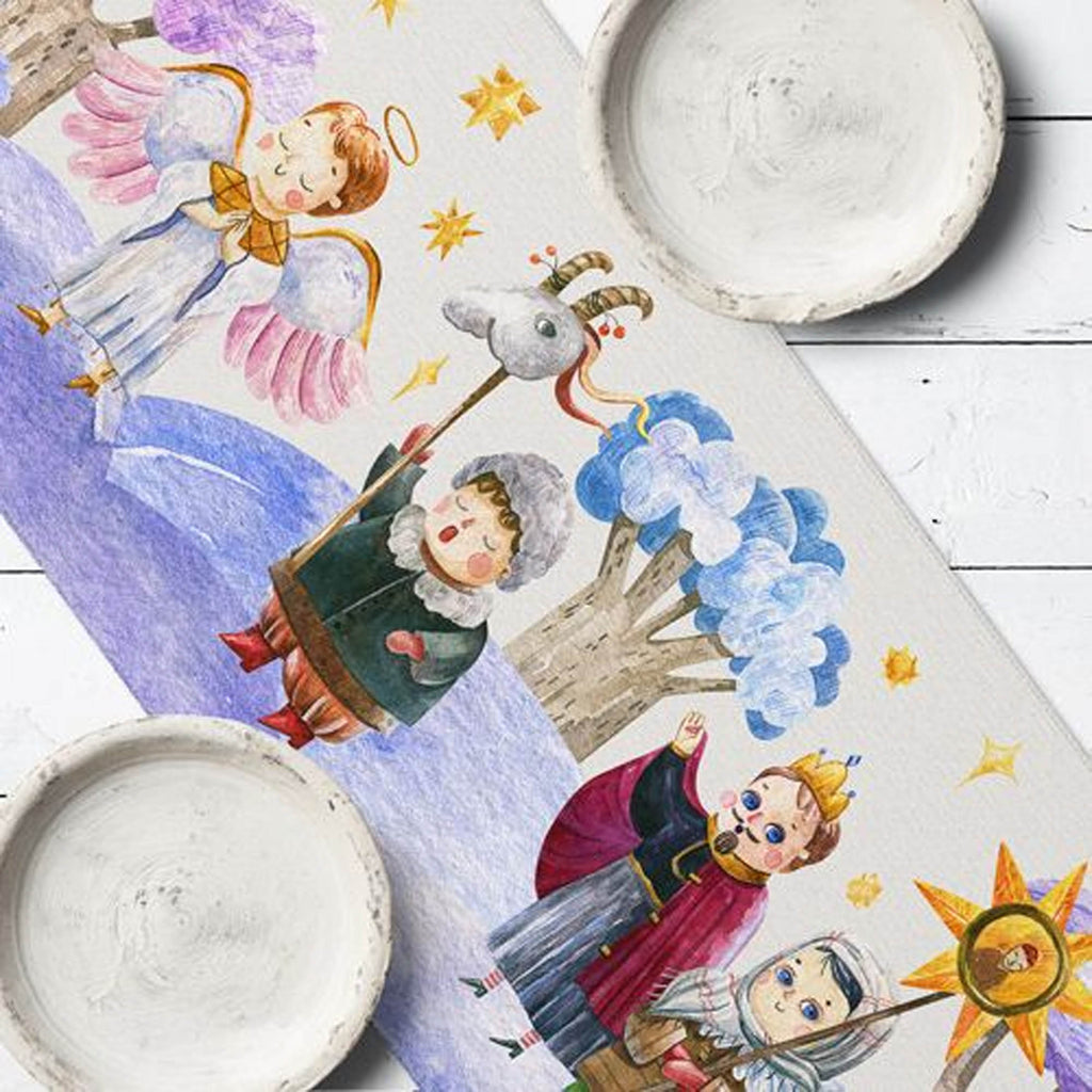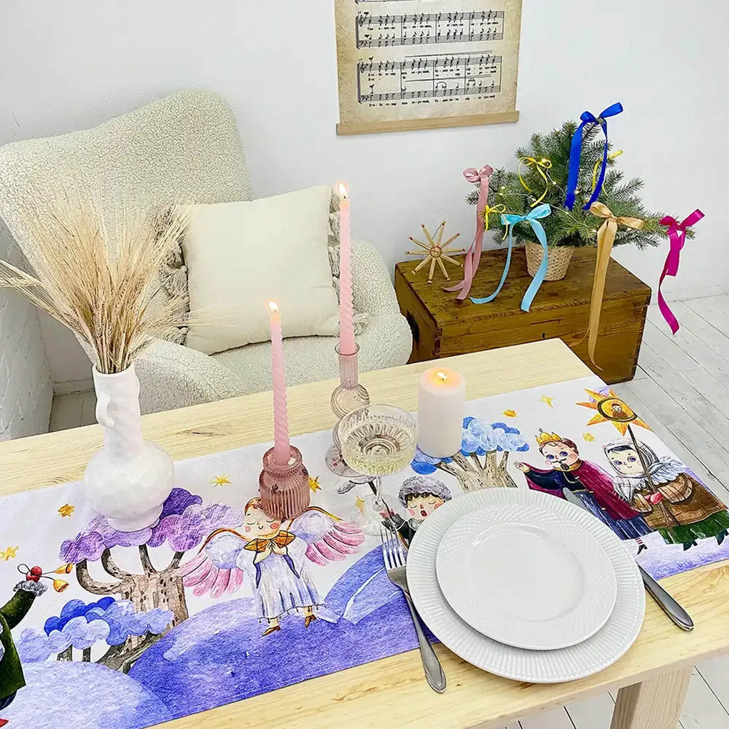 Дорожка на стол КОЛЯДНИКИ — праздничный декоративный аксессуар для создания уютной атмосферы на столе во время зимних праздников. Идеально подходит для сервировки в период Рождества и новогодних праздников.