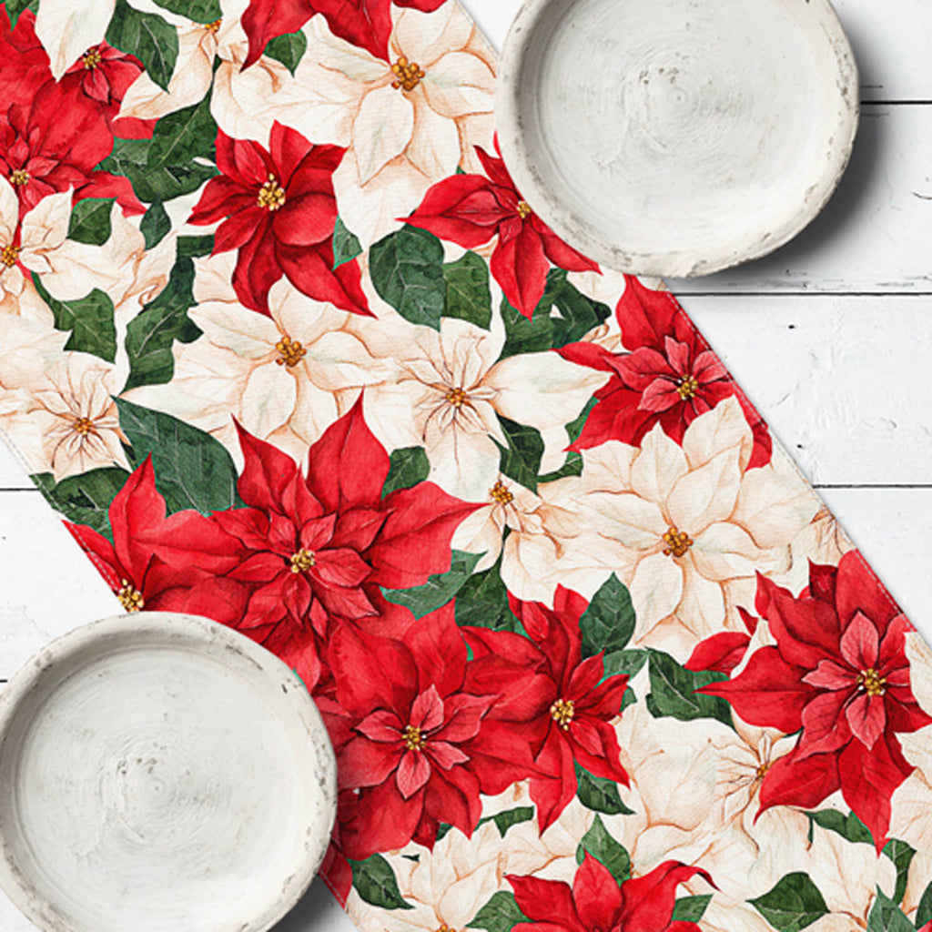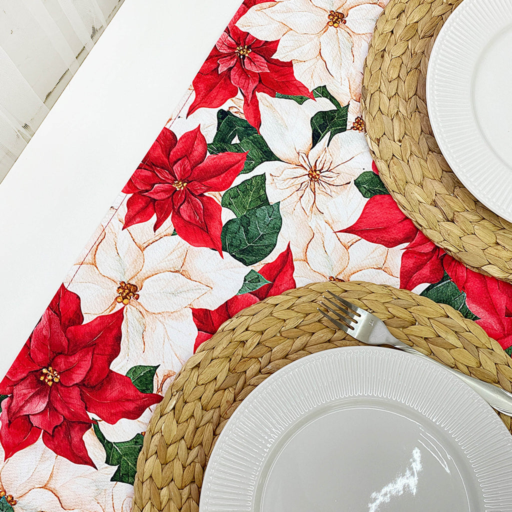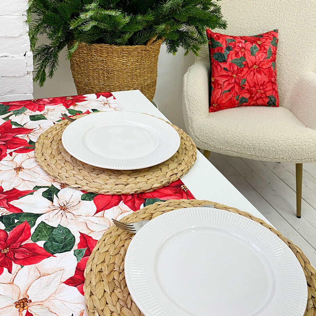 Дорожка на стол РОЖДЕСТВЕНСКИЕ ЦВЕТЫ — изысканный праздничный акцент, который добавит сервировке тепла, уюта и новогоднего настроения. Идеально подходит для декора как кухни, так и гостиной.