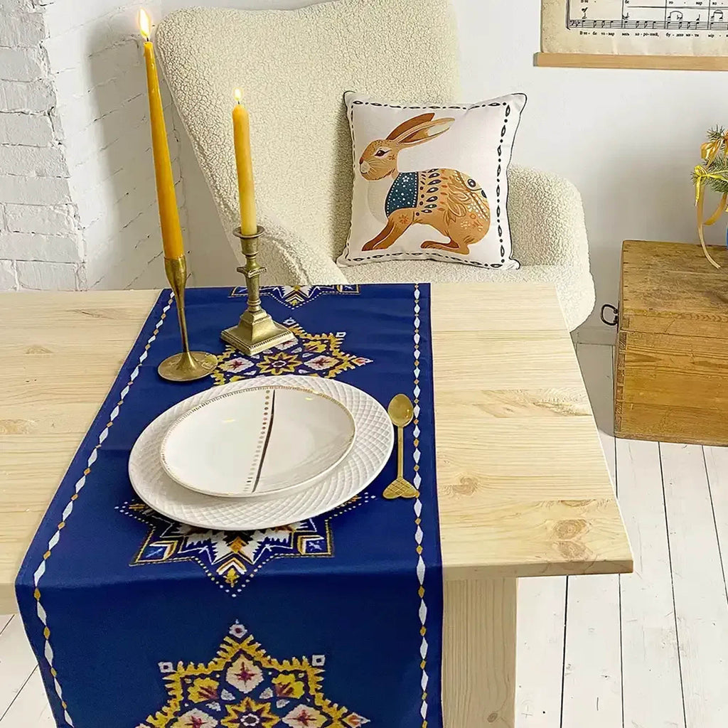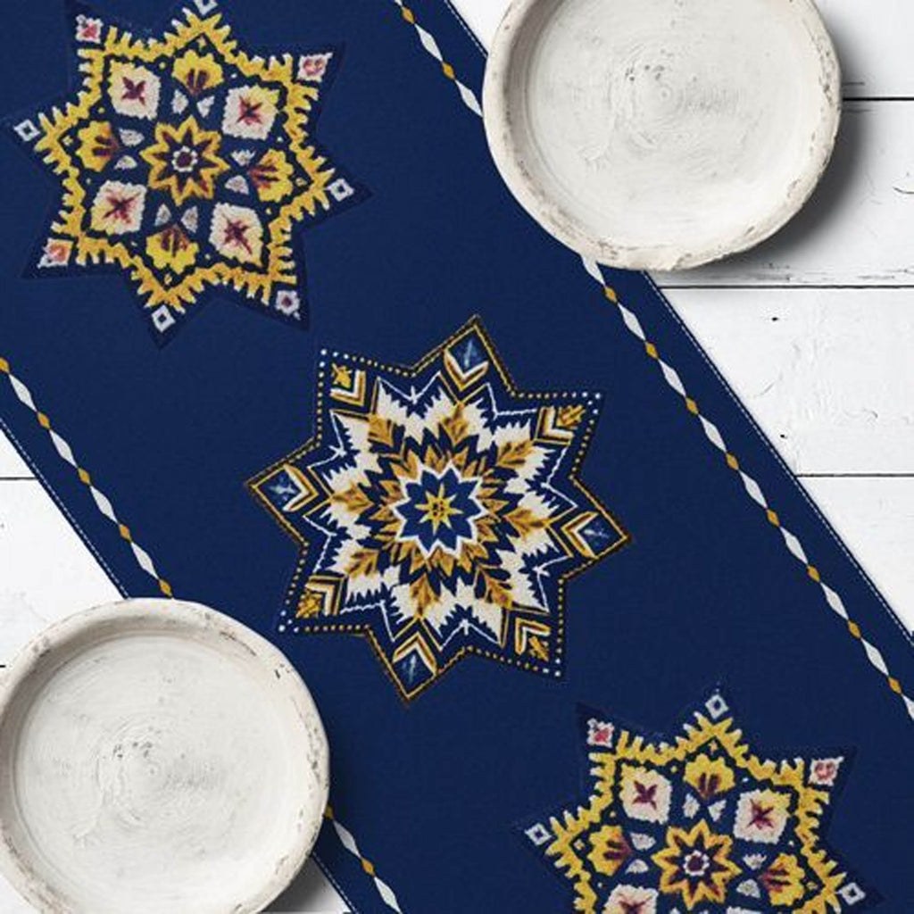 Дорожка на стол РОЖДЕСТВЕНСКИЕ ЗВЁЗДЫ НА СИНЕМ ФОНЕ — праздничный аксессуар, создающий атмосферу уюта и волшебства на вашем столе. Идеально подходит для сервировки в период зимних праздников и как декоративный элемент интерьера.