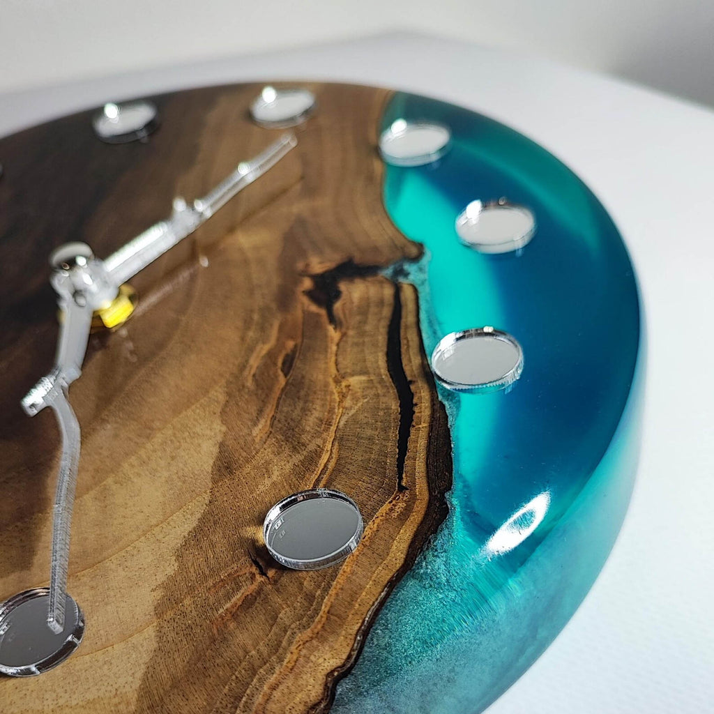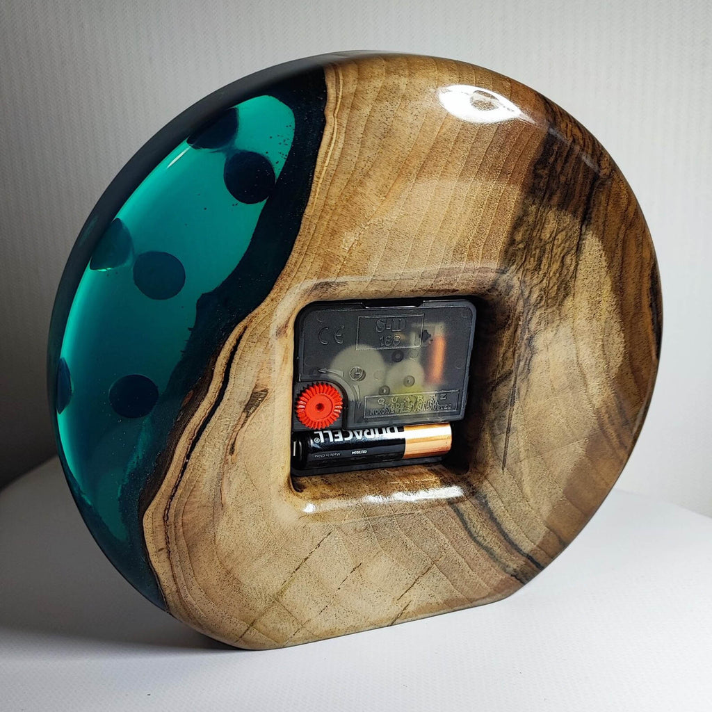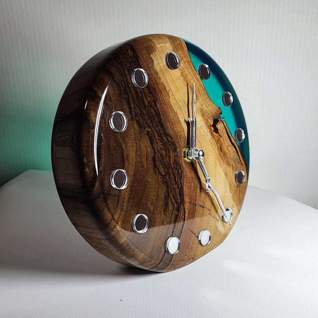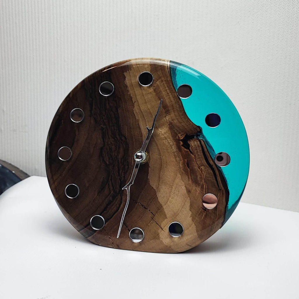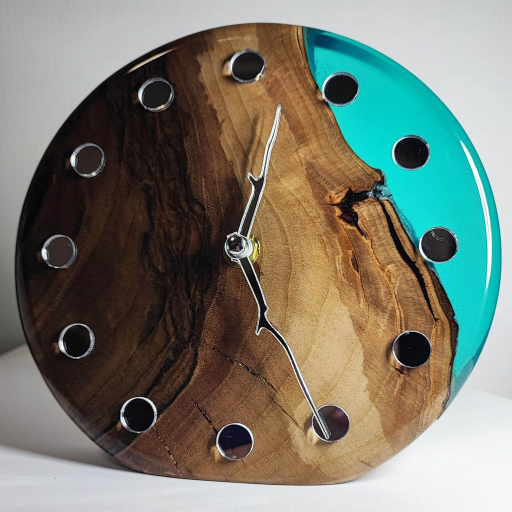Настольные часы БУБЛИК — это изысканное сочетание природной красоты древесины ореха и современной эстетики эпоксидной смолы. Бирюзовый оттенок смолы придаёт изделию свежесть и оригинальность, а натуральная текстура дерева создаёт тёплую, уютную атмосферу. Каждые часы изготавливаются вручную, поэтому имеют свой уникальный характер и неповторимый рисунок. Такой аксессуар станет стильным акцентом в вашем интерьере — дома или в офисе.