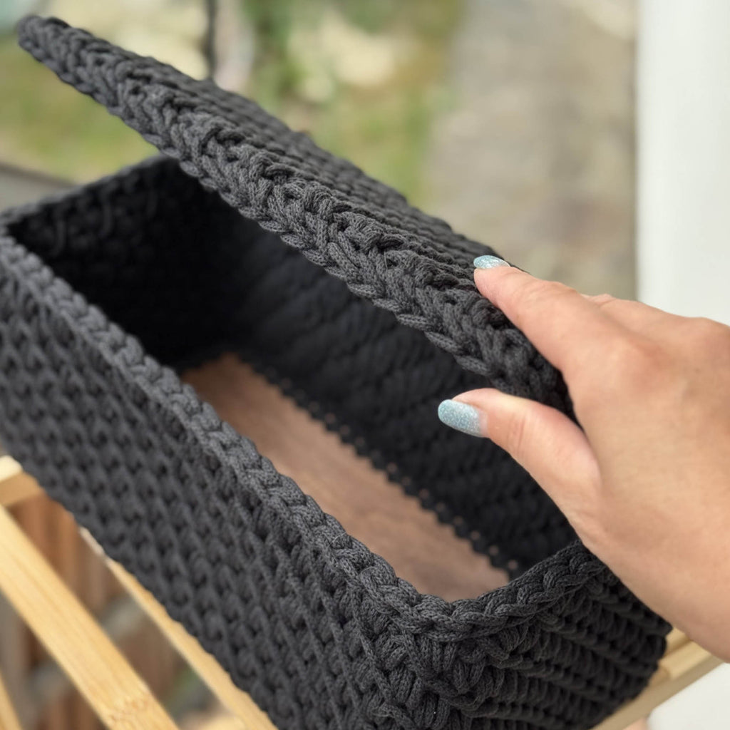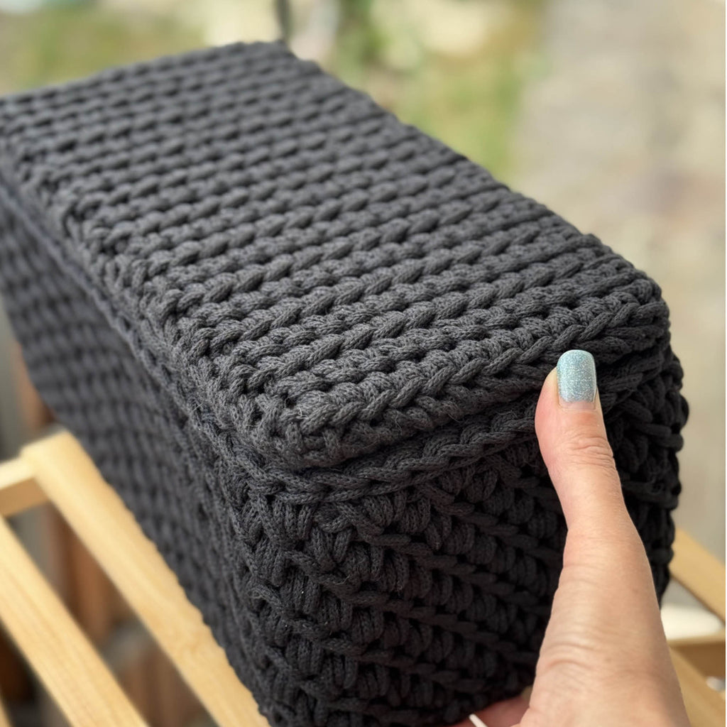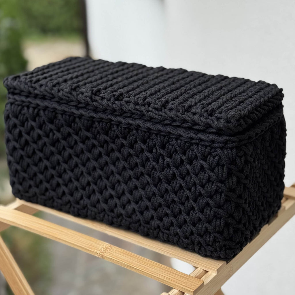 Вязаная корзина с крышкой — стильный и практичный аксессуар для дома, который поможет поддерживать порядок и одновременно украсит интерьер. Изготовлена вручную из прочного хлопкового шнура, она идеально подходит для хранения мелочей: косметики, украшений, аксессуаров или бытовых мелочей. Благодаря крышке всё всегда будет аккуратно спрятано.