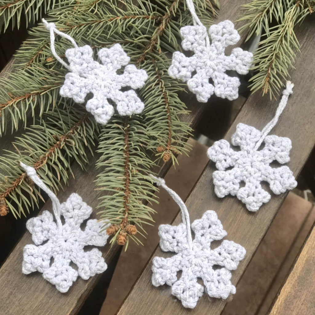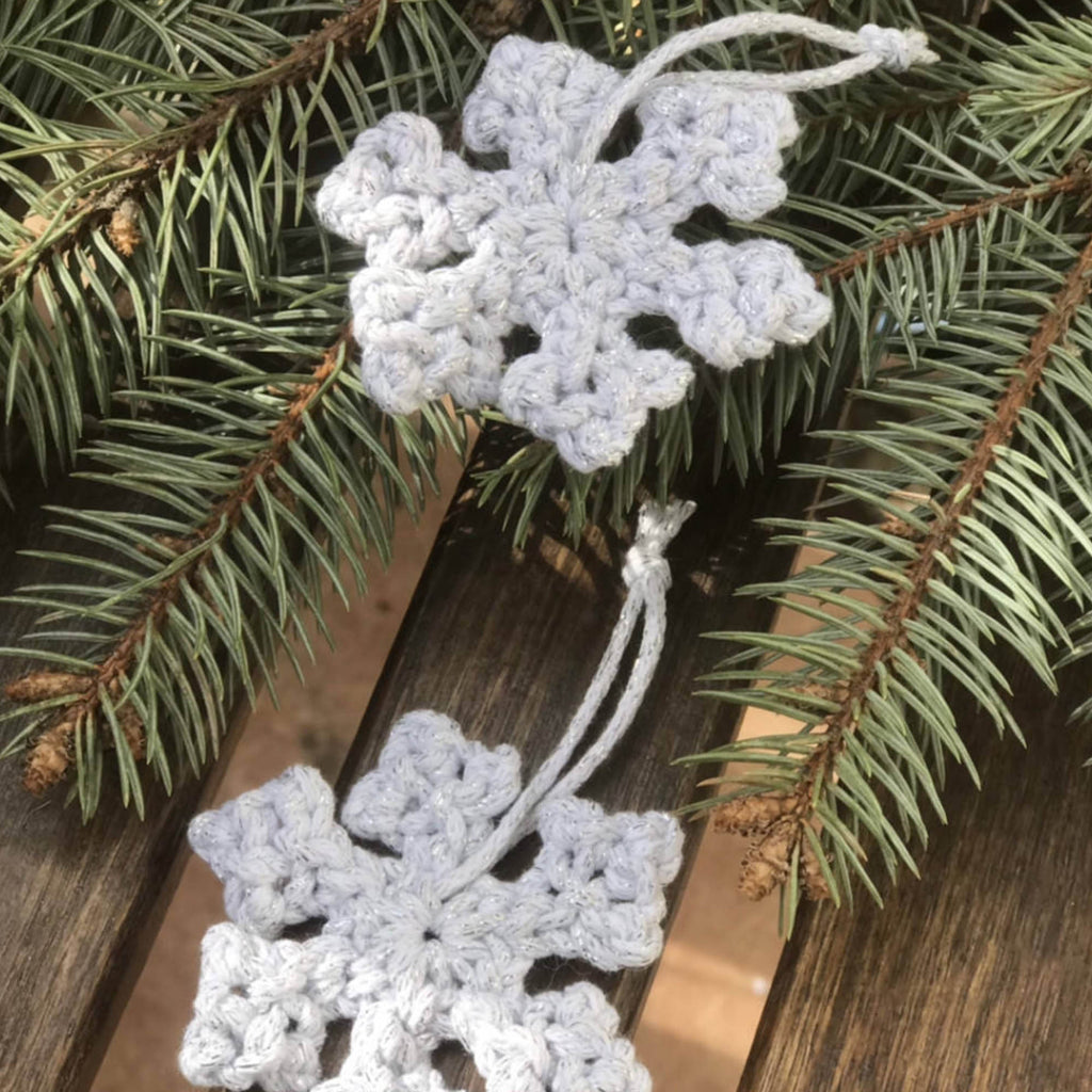 Цена за набор 5 шт. Снежинка вязаная ручной работы. Безопасный и стильный декор на елку, оригинальные эко украшения, которые останутся у вас на много лет. Цвет шнура белый+серебро. Размер снежинки по углам ~7см