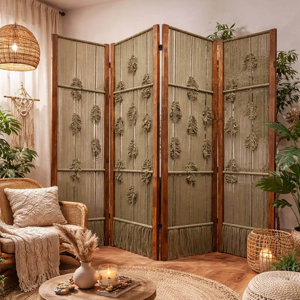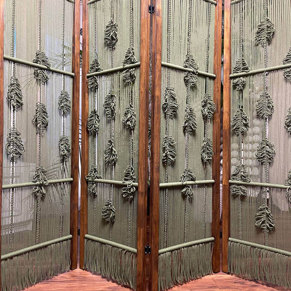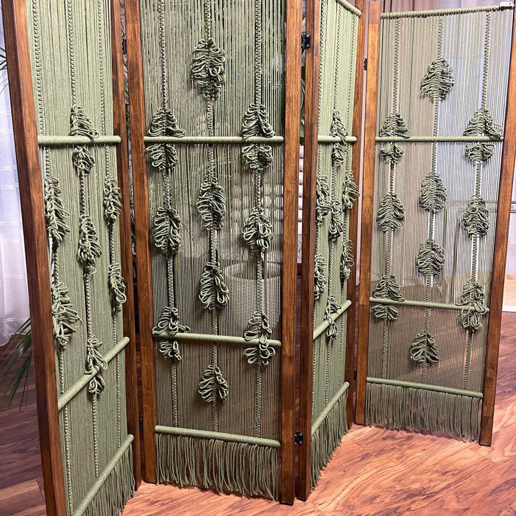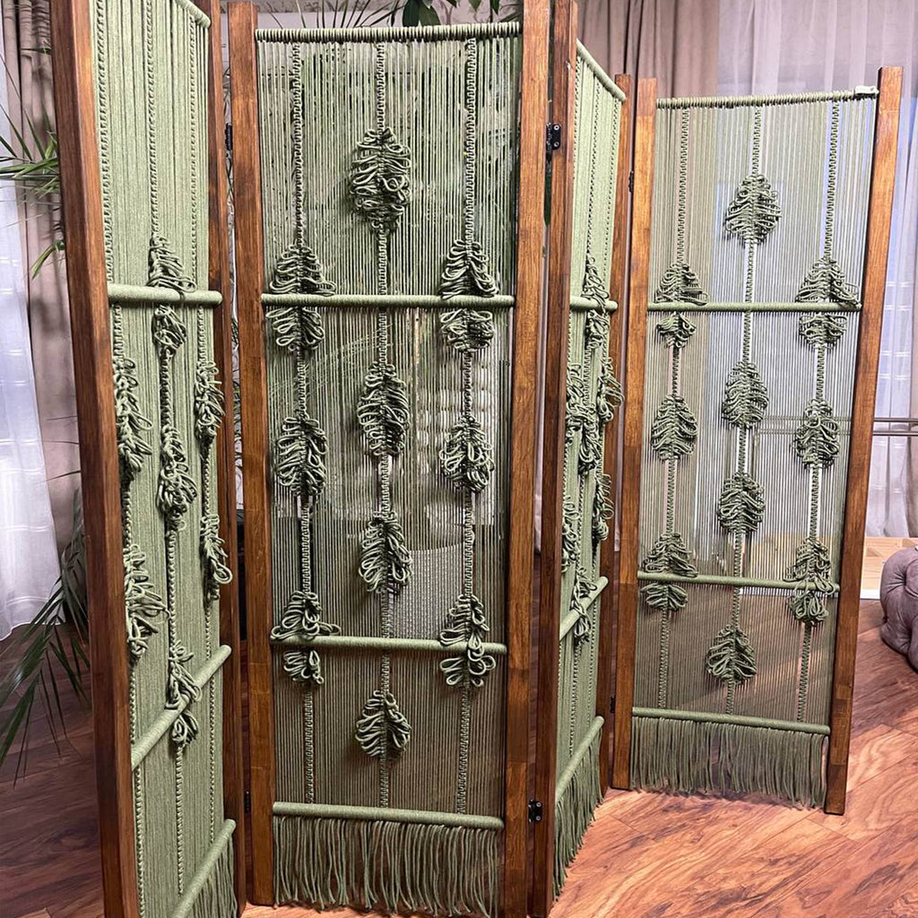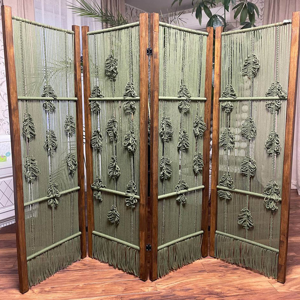 Естетична деревʼяна ширма з гачкованими елементами — стильне та функціональне рішення для зонування простору. Вона додає інтер’єру легкості, затишку й природного шарму, гармонійно поєднуючи натуральне дерево та ручну роботу з бавовняних ниток. Ширма чудово підійде для спальні, вітальні, студії, фотозони або тераси.