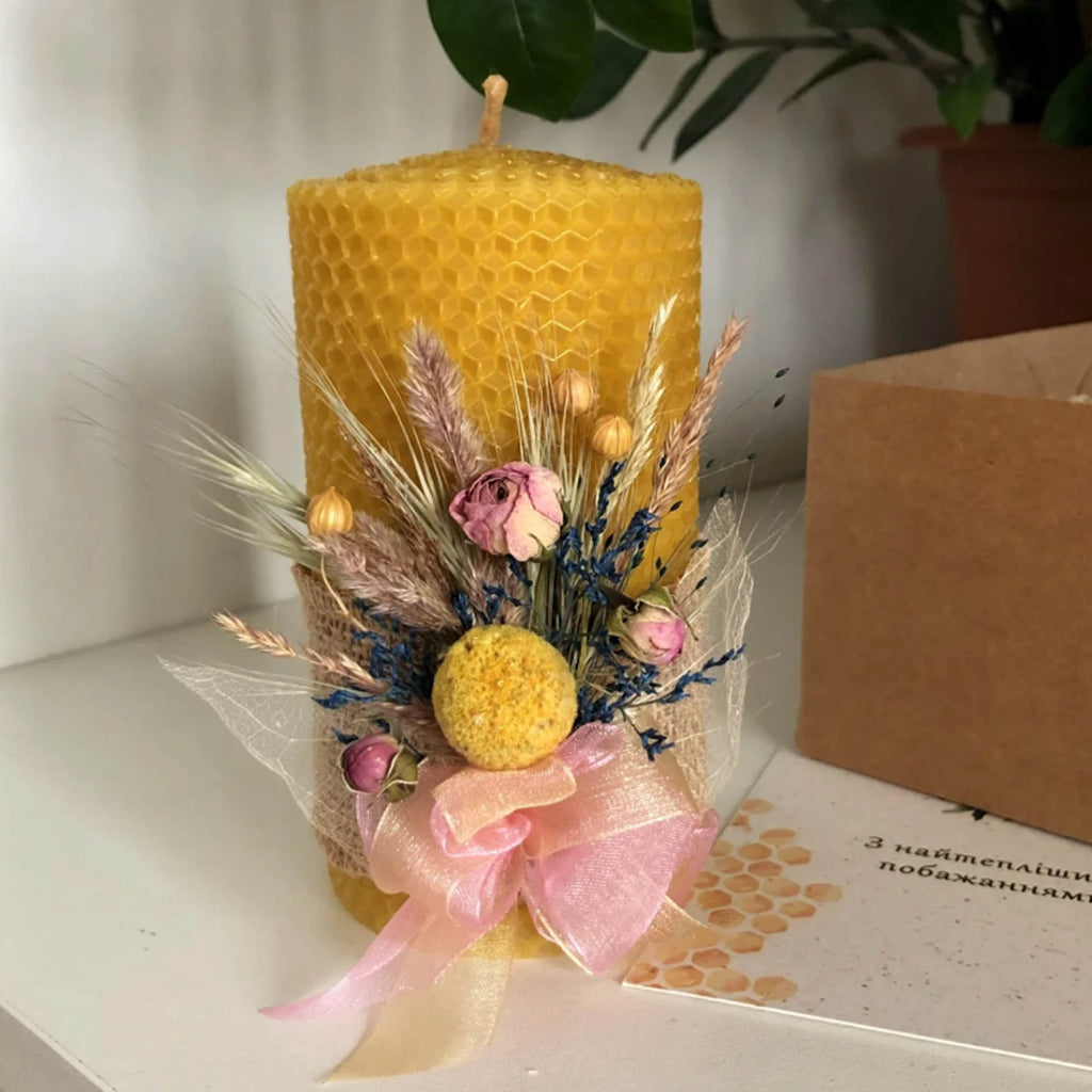 Свеча толстая и массивная, отличный вариант для подарка или комплимента. Свеча уже в подарочной коробке, с открыткой и бантиком. Декор более женственный, об этом говорят нежные бутоны и воздушные скелетированные листья. Ярко-медовый желтый цвет вощины с золотой пылью. А в декоре — просто взрыв цветов и трав. В композиции смело сочетала еще розовый и голубовато-синий цвет сухоцветов.