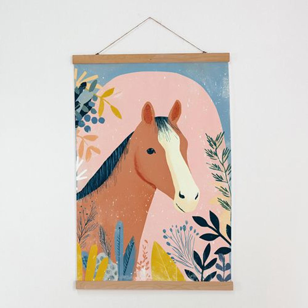 Тканевый постер КОНЬ станет стильным акцентом в вашем интерьере. Натуральные деревянные планки сверху и снизу придают изделию опрятный вид, а верхняя планка с веревкой позволяет легко закрепить постер на стене. Нижняя планка удерживает ткань ровной и предотвращает скручивание.