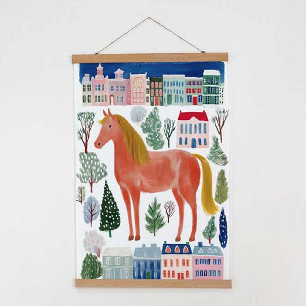 Тканевый постер КОНЬ В ГОРОДЕ — стильный и эффектный акцент для современного интерьера. Благодаря деревянным планкам сверху и снизу постер выглядит аккуратно и сохраняет идеальную форму. Верхняя планка оснащена веревкой, что позволяет легко повесить декор на любое крепление. Нижняя фиксирует ткань, не давая ей сворачиваться.